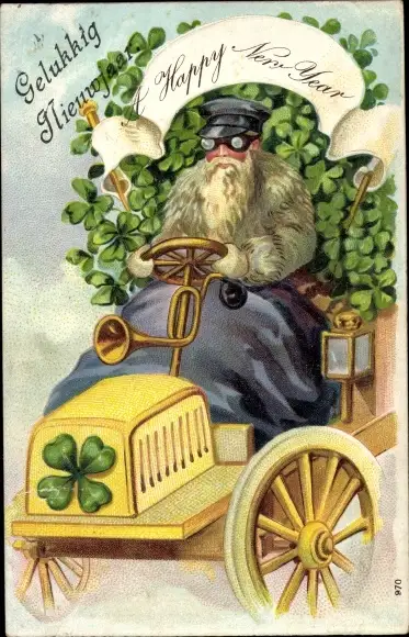 Präge Ak Glückwunsch Neujahr, Happy New Year, Mann am Steuer eines Automobils, Kleeblätter