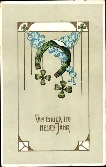 Präge Ak Glückwunsch Neujahr, Hufeisen, Glücksklee, Vergissmeinnicht