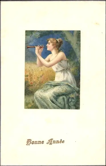 Präge Ak Glückwunsch Neujahr, Junge Frau spielt Flöte
