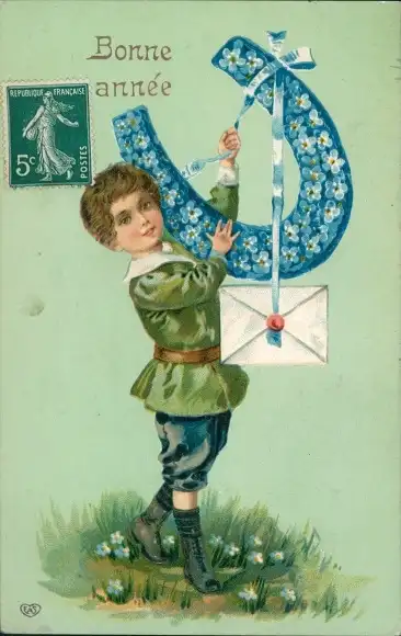 Präge Ak Glückwunsch Neujahr, Junge, Vergissmeinnicht, Hufeisen