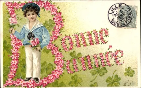 Präge Ak Glückwunsch Neujahr, Junge mit Blumenstrauß, Rosen, Glücksklee