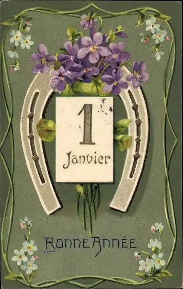 Präge Ak Glückwunsch Neujahr, Kalender, Hufeisen, 1. Januar