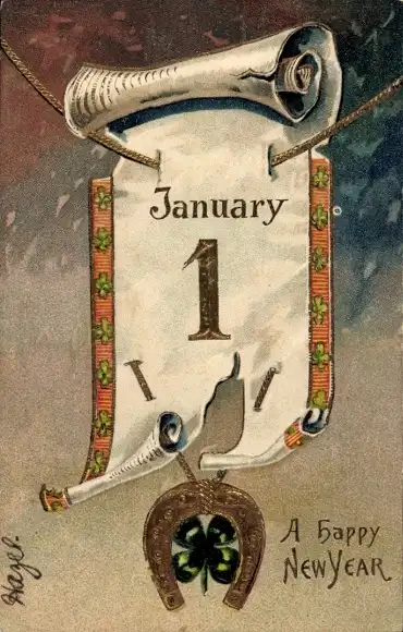 Präge Ak Glückwunsch Neujahr, Kalender, Hufeisen, Glücksklee