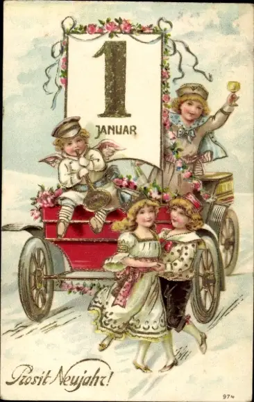 Präge Ak Glückwunsch Neujahr, Kalender, Kinder, Engel, Auto