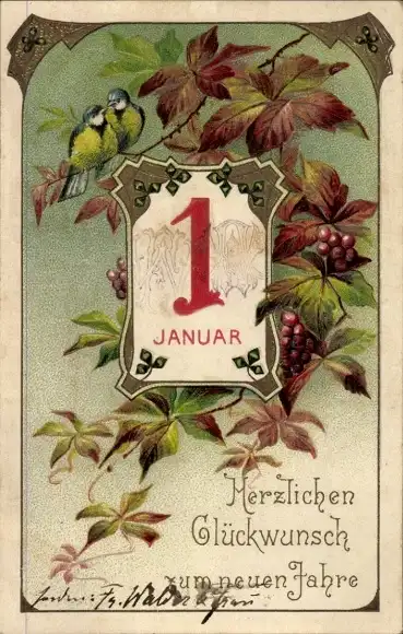 Präge Ak Glückwunsch Neujahr, Kalender, Meisen, Früchte