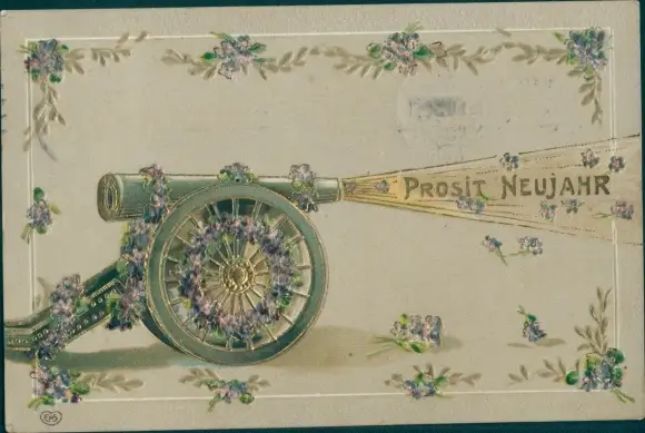 Präge Ak Glückwunsch Neujahr, Kanone, Veilchen
