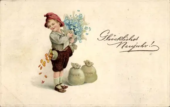 Präge Ak Glückwunsch Neujahr, Kind, Geldsack, Vergissmeinnicht