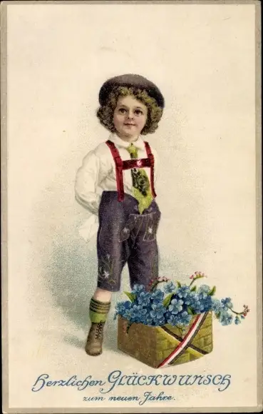 Präge Ak Glückwunsch Neujahr, Kind, Korb mit Vergissmeinnicht, Waffenbrüderschaft