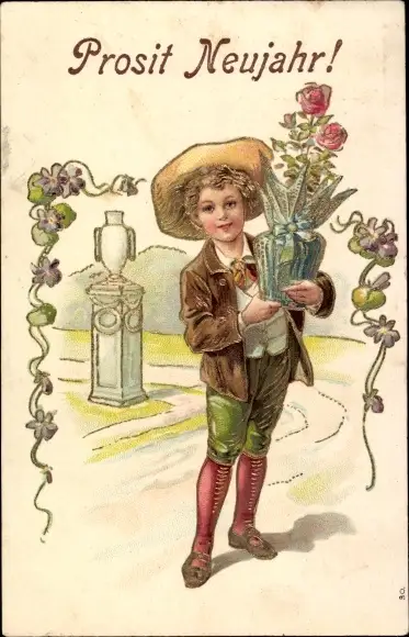 Präge Ak Glückwunsch Neujahr, Kind, Rose, Blumenvase