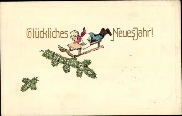 Präge Ak Glückwunsch Neujahr, Kind, Schlitten, Tannenzweig