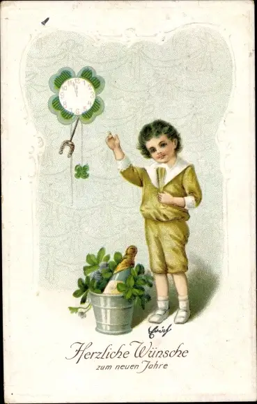 Präge Ak Glückwunsch Neujahr, Kind, Sektflasche, Glücksklee, Uhr