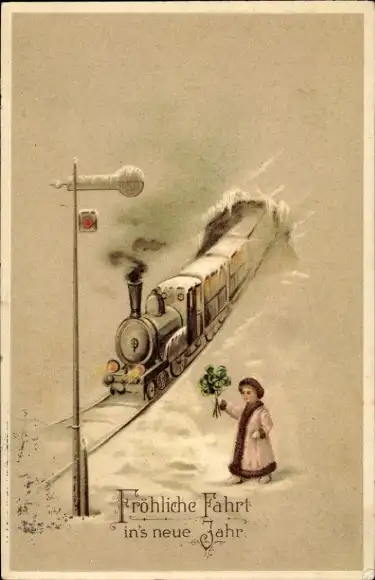 Präge Ak Glückwunsch Neujahr, Kind mit Glücksklee, Eisenbahn