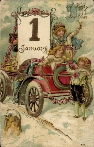 Präge Ak Glückwunsch Neujahr, Kinder, Auto, Kalender