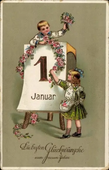 Präge Ak Glückwunsch Neujahr, Kinder, Kalender, Rosen