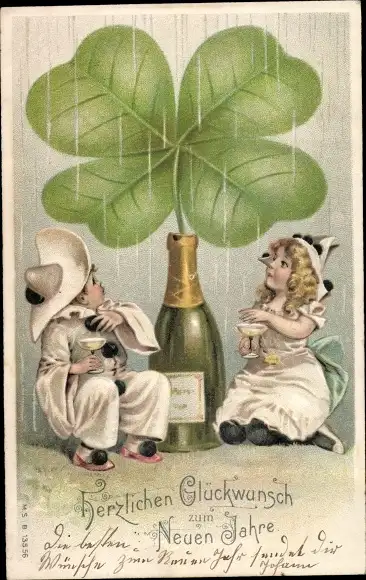 Präge Ak Glückwunsch Neujahr, Kinder, Kleeblatt, Sektflasche
