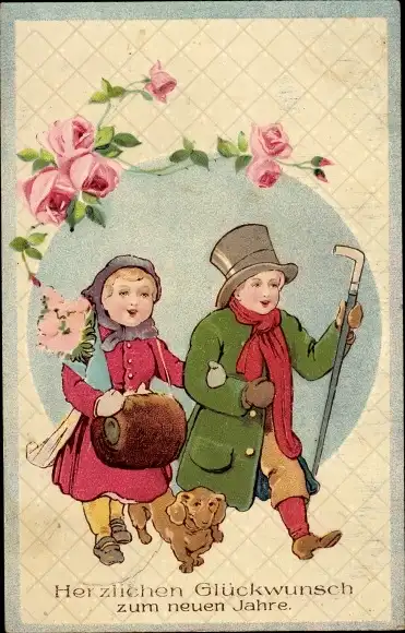 Präge Ak Glückwunsch Neujahr, Kinder, Muff, Hund, Rosen