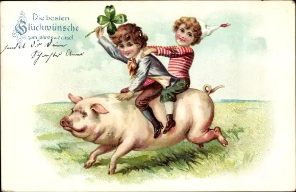 Präge Ak Glückwunsch Neujahr, Kinder auf Schwein reitend, Glücksklee