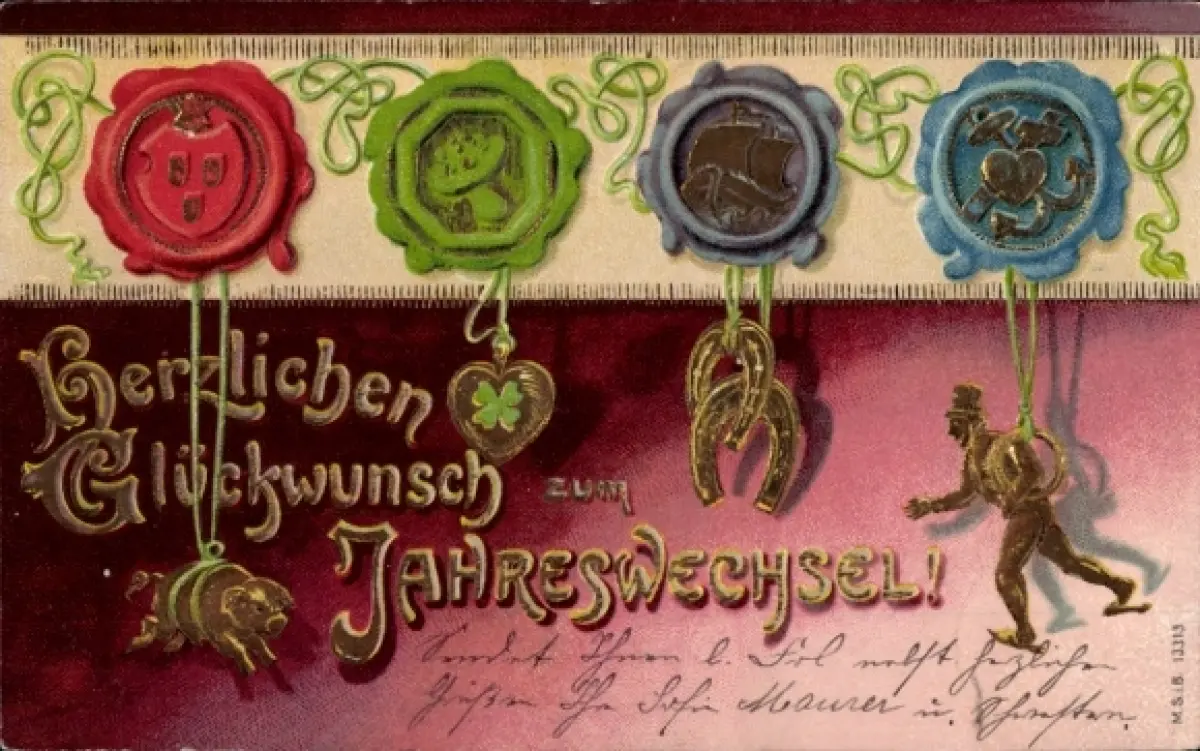 Präge Ak Glückwunsch Neujahr, Kleeblatt, Hufeisen, Schornsteinfeger
