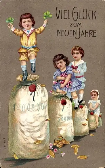 Präge Ak Glückwunsch Neujahr, Kleeblatt, Kinder, Geldsäcke