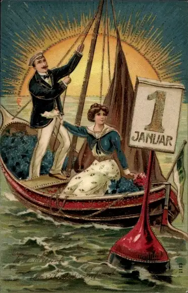 Präge Ak Glückwunsch Neujahr, Liebespaar im Ruderboot, Kalender, Boje
