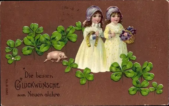 Präge Ak Glückwunsch Neujahr, Mädchen, Blumen, Glücksklee, Hufeisen, Schwein