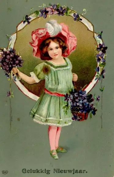 Präge Ak Glückwunsch Neujahr, Mädchen, Blumenkorb