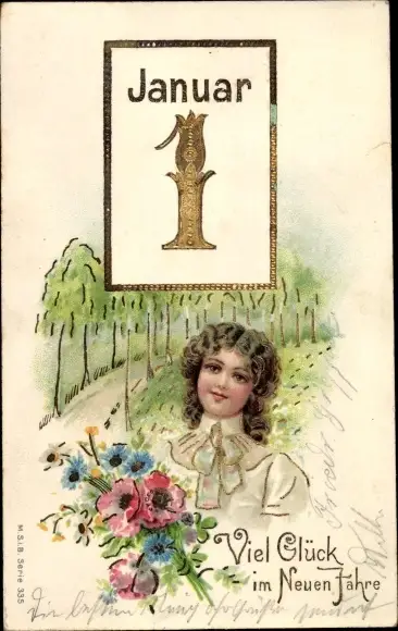 Präge Ak Glückwunsch Neujahr, Mädchen, Blumenstrauß, Kalender