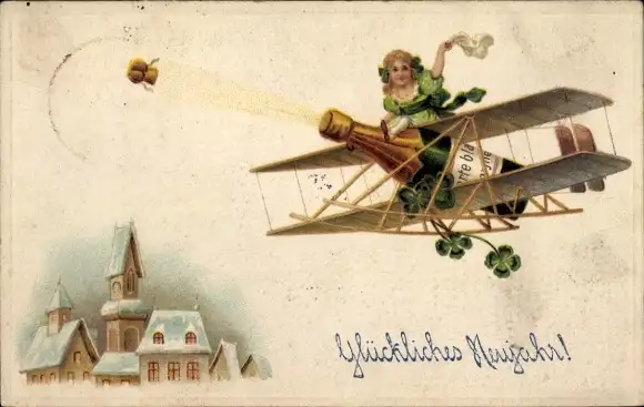 Präge Ak Glückwunsch Neujahr, Mädchen, Flugzeug, Glücksklee, Sektflasche