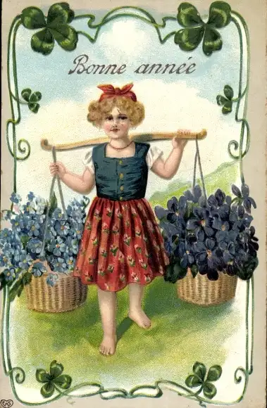 Präge Ak Glückwunsch Neujahr, Mädchen, Körbe mit Blumen, Veilchen, Vergissmeinnicht