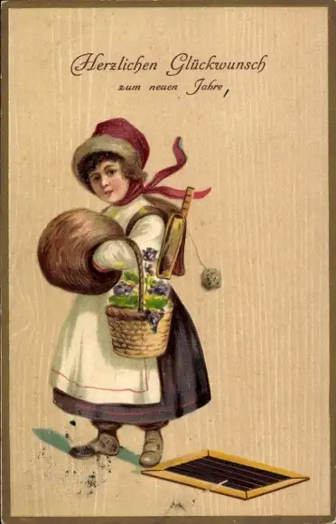 Präge Ak Glückwunsch Neujahr, Mädchen, Muff, Korb