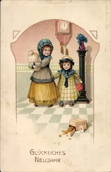 Präge Ak Glückwunsch Neujahr, Mädchen, Uhr, Geldsack