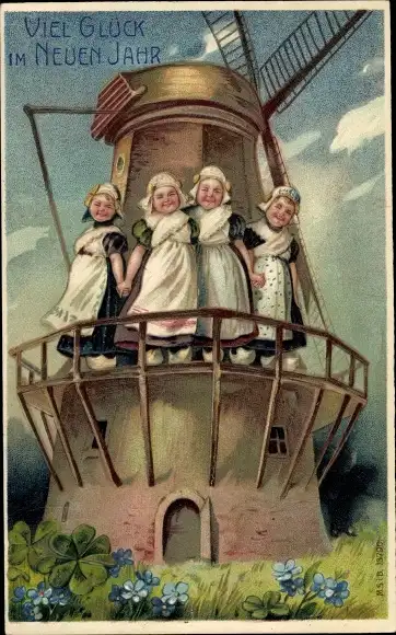 Präge Ak Glückwunsch Neujahr, Mädchen in Trachten auf einer Windmühle, Kleeblätter