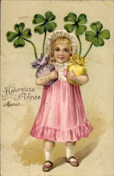 Präge Ak Glückwunsch Neujahr, Mädchen mit Kleeblättern