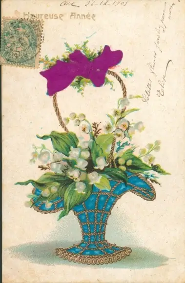 Präge Ak Glückwunsch Neujahr, Maiglöckchen im Korb, Schleife