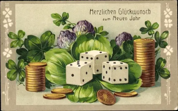 Präge Ak Glückwunsch Neujahr, Münzen, Klee, Würfel