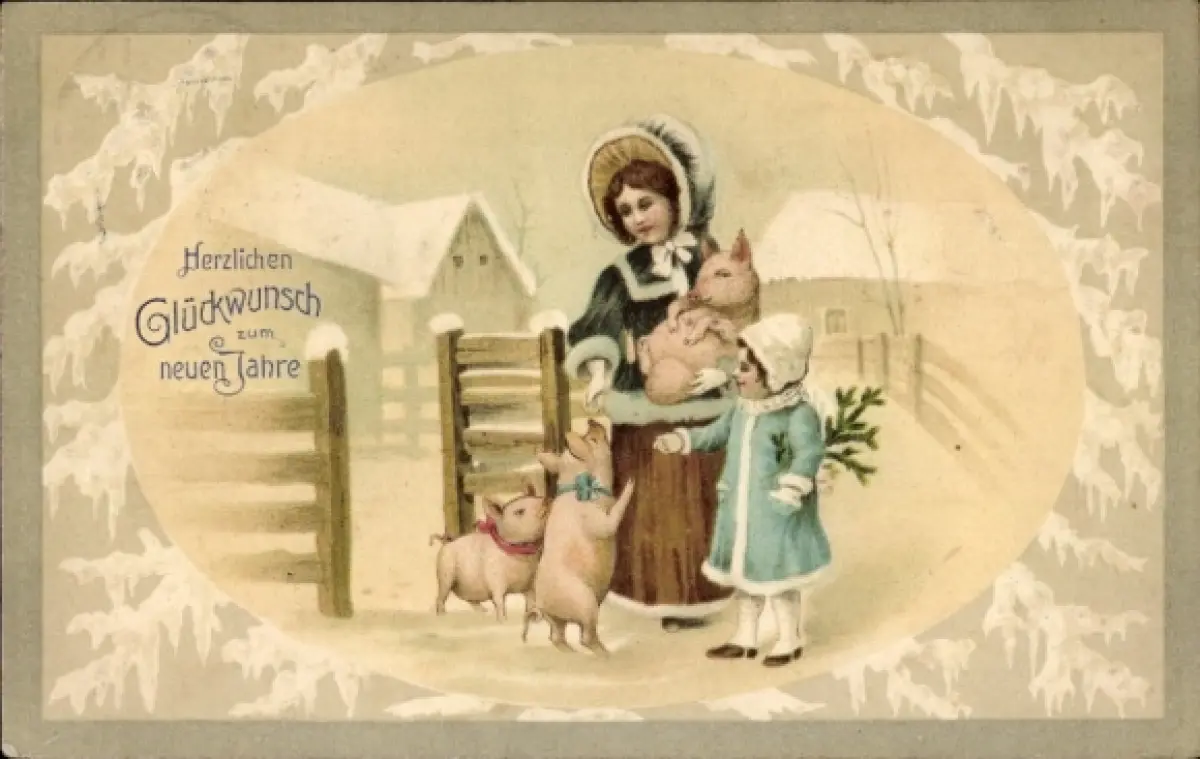 Präge Ak Glückwunsch Neujahr, Mutter mit Tochter, Schweine