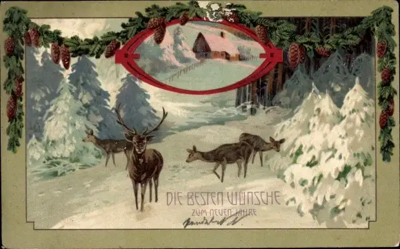 Präge Ak Glückwunsch Neujahr, Rehe, Hirsch, Tannenzapfen