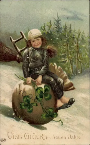 Präge Ak Glückwunsch Neujahr, Schornsteinfeger mit Kleeblättern, Geldsack