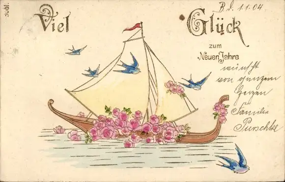 Präge Ak Glückwunsch Neujahr, Schwalben, Schiff, Blumen