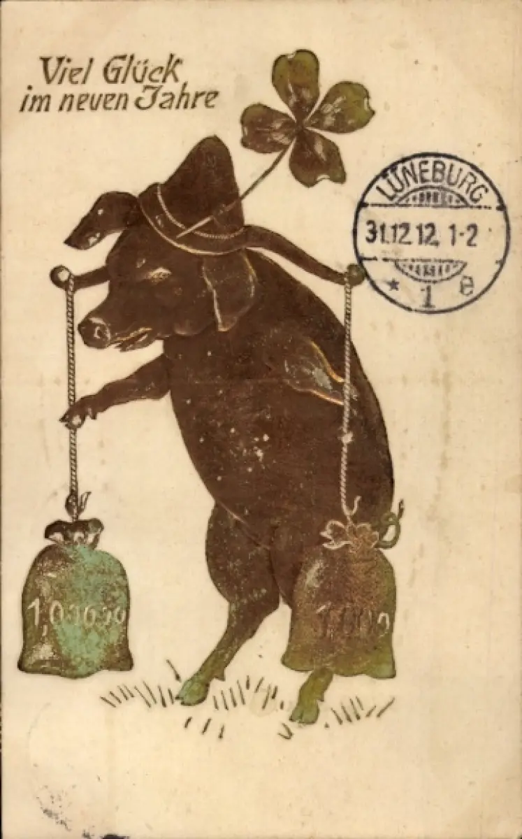 Präge Ak Glückwunsch Neujahr, Schwein, Geldsäcke, Glücksklee