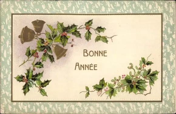 Präge Ak Glückwunsch Neujahr, Stechpalme, Mistelzweige, Glocken