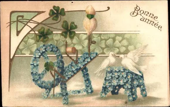 Präge Ak Glückwunsch Neujahr, Tauben, Glücksklee, Vergissmeinnicht