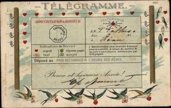 Präge Ak Glückwunsch Neujahr, Telegramm, Schwalben, Herzen, Telefonmast