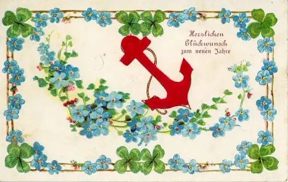 Präge Ak Glückwunsch Neujahr, Vergissmeinnicht, Glücksklee, Anker