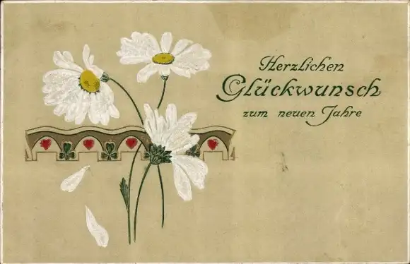 Präge Ak Glückwunsch Neujahr, Weiße Blumen, Herzen