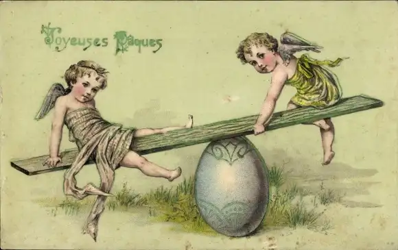 Präge Ak Glückwunsch Ostern, Engel beim Wippen, Osterei