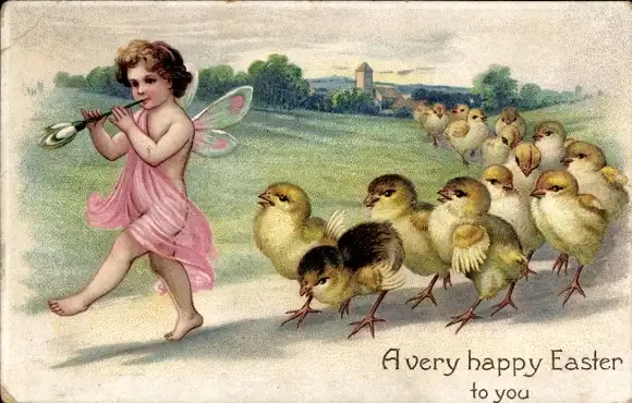 Präge Ak Glückwunsch Ostern, Fee, Küken, Blume
