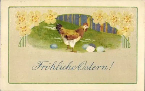 Präge Ak Glückwunsch Ostern, Henne, Eier, Blumen
