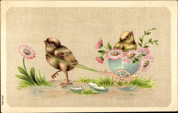 Präge Ak Glückwunsch Ostern, Küken, Osterei, Fuhrwerk, Margeriten