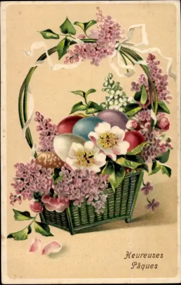 Präge Ak Glückwunsch Ostern, Ostereier, Blumenkorb